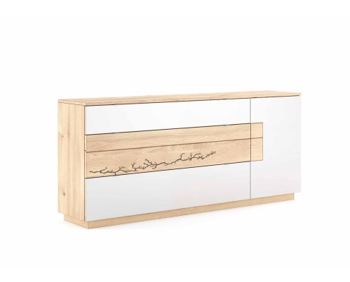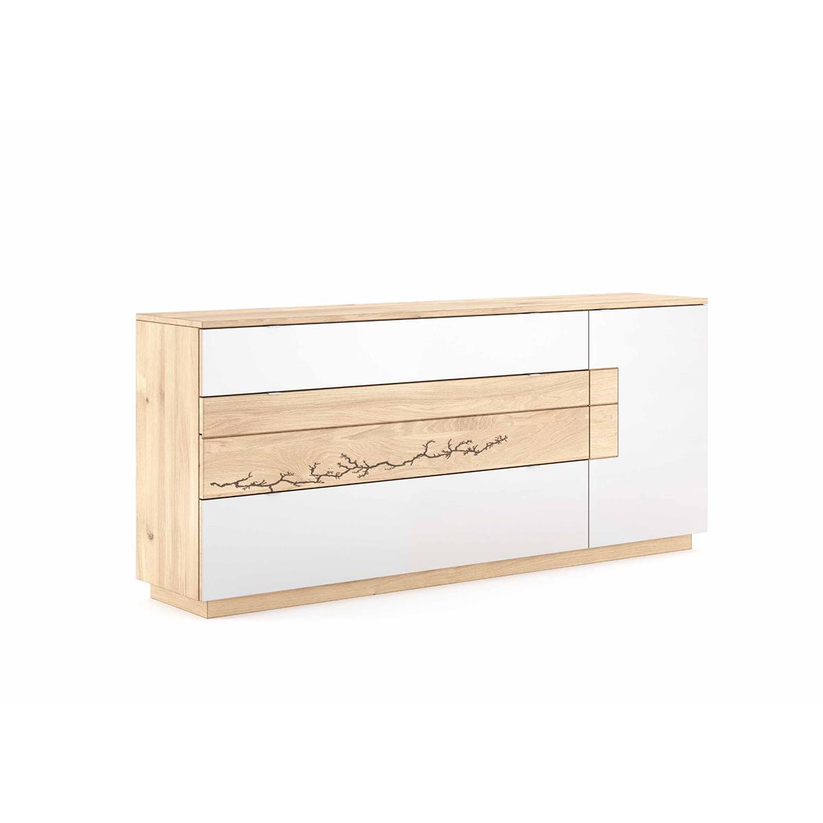 Sideboard, rustikale Asteiche Hartwachsöl Bianco geschliffen, satiniertes Glas, weiß, nickelfarbig, Holzsockel in Korpusfarbe, Metallgriff, B/H/T ca. 201,6×88,2x42cm