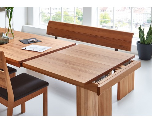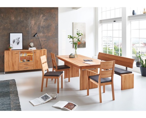 „Für Ihr Speisezimmer finden Sie bei uns Esstische mit und ohne Funktion sowie aus reinem Echtholz oder im Materialmix mit Metall. Tische aus natürlichem Holz eignen sich vor allem für das Einrichten im Landhausstil oder für einen Speisebereich mit rustikalem Charme. Die lebendige Maserung des Holzes sowie seine individuellen Wuchsmerkmale sorgen für eine warme und behagliche Atmosphäre, in der Sie nach einem anstrengenden Tag leicht entspannen können. Ein Holz-Tisch, beispielsweise ein Tisch Eiche oder ein Tisch Nussbaum, wird dabei ganz klar zum Mittelpunkt in Ihrem Speisezimmer. Hier kann sich die ganze Familie treffen, miteinander reden, genießen und unbeschwert beisammen sein.“