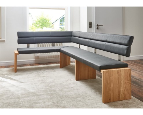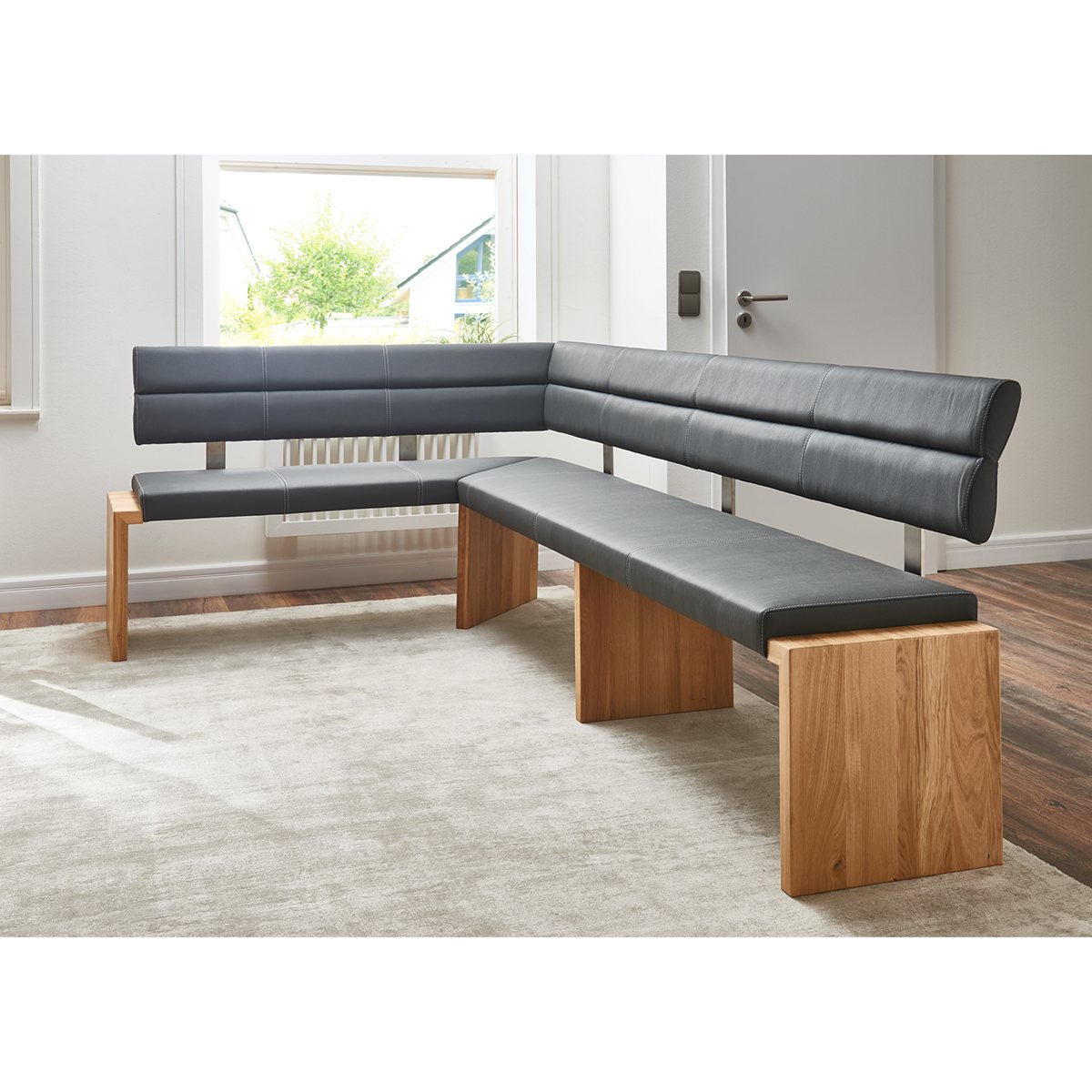 Eckbank, rustikale Asteiche Hartwachsöl natur geschliffen, Holzwangen nickelfarbg. gebürstet, Bezug PG2/V109 Verano Nussbraun, Ton in Ton, SH/ST ca. 47,6x43cm, L/B/H ca. 390x55x84cm