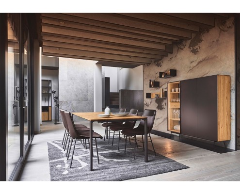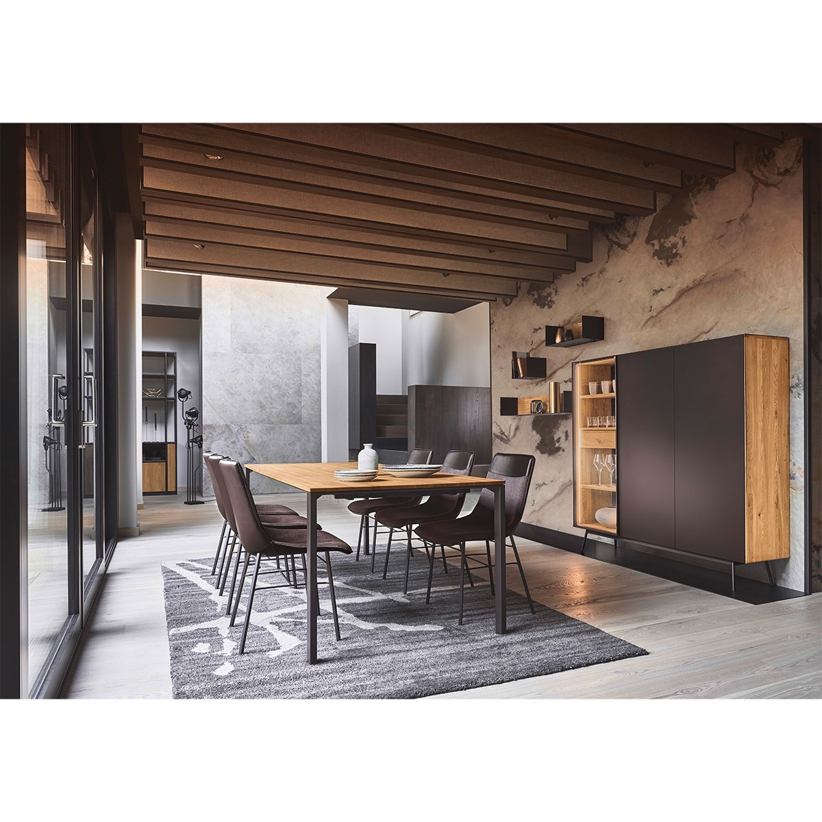 „Die Massivholzmöbel unserer Speisezimmer-Kollektion LINJA lassen robustes Massivholz und starkes Metall fast schweben. Denn ihnen liegt ein Design-Konzept zugrunde, das auf reduzierte Strukturen setzt. So machen die Esstische, Stühle, Bänke und Beimöbel Ihr Esszimmer zum stilvollen Mittelpunkt in Ihrem Zuhause. Mit klaren Strukturen überzeugt unserer Ensemble L20. Die Untergestelle von Tisch, Stühlen sowie Beimöbeln sind aus starkem Metall filigran umgesetzt und optisch perfekt aufeinander abgestimmt. Mit einem High- oder Sideboard unserer Kollektion LINJA schaffen Sie nicht nur jede Menge Stauraum in Ihrem Essbereich. Sie zaubern auch eine stilvolle Atmosphäre voll edler Details.“