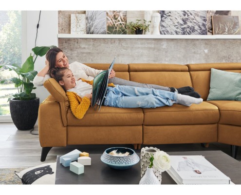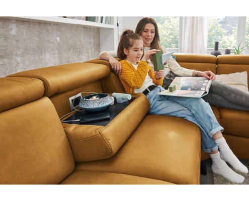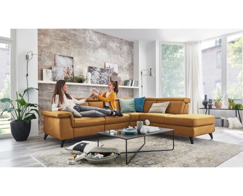 Diese modernen Polstermöbel werden sofort zum Mittelpunkt Ihres Wohnzimmers werden. Neben ihrem trendigen Design und den großzügigen Ausmaßen zeichnen sie sich auch durch viele optional planbare Funktionsausstattungen aus. Mit ihrem zeitlosen Stil fügt sich dieses Polsterprogramm mühelos in nahezu jedes Interieur ein.“