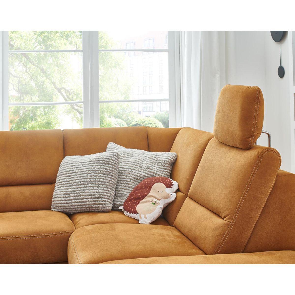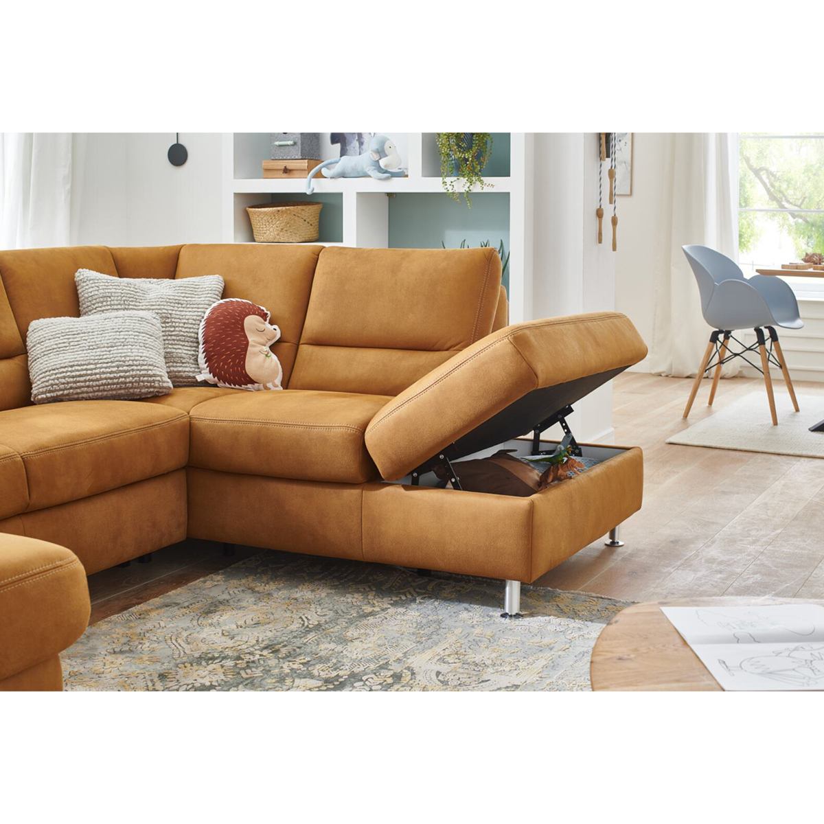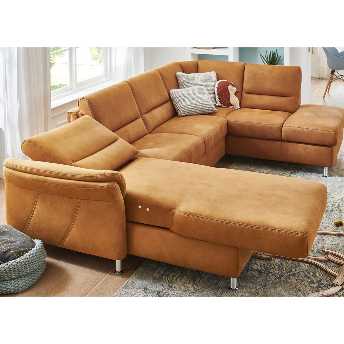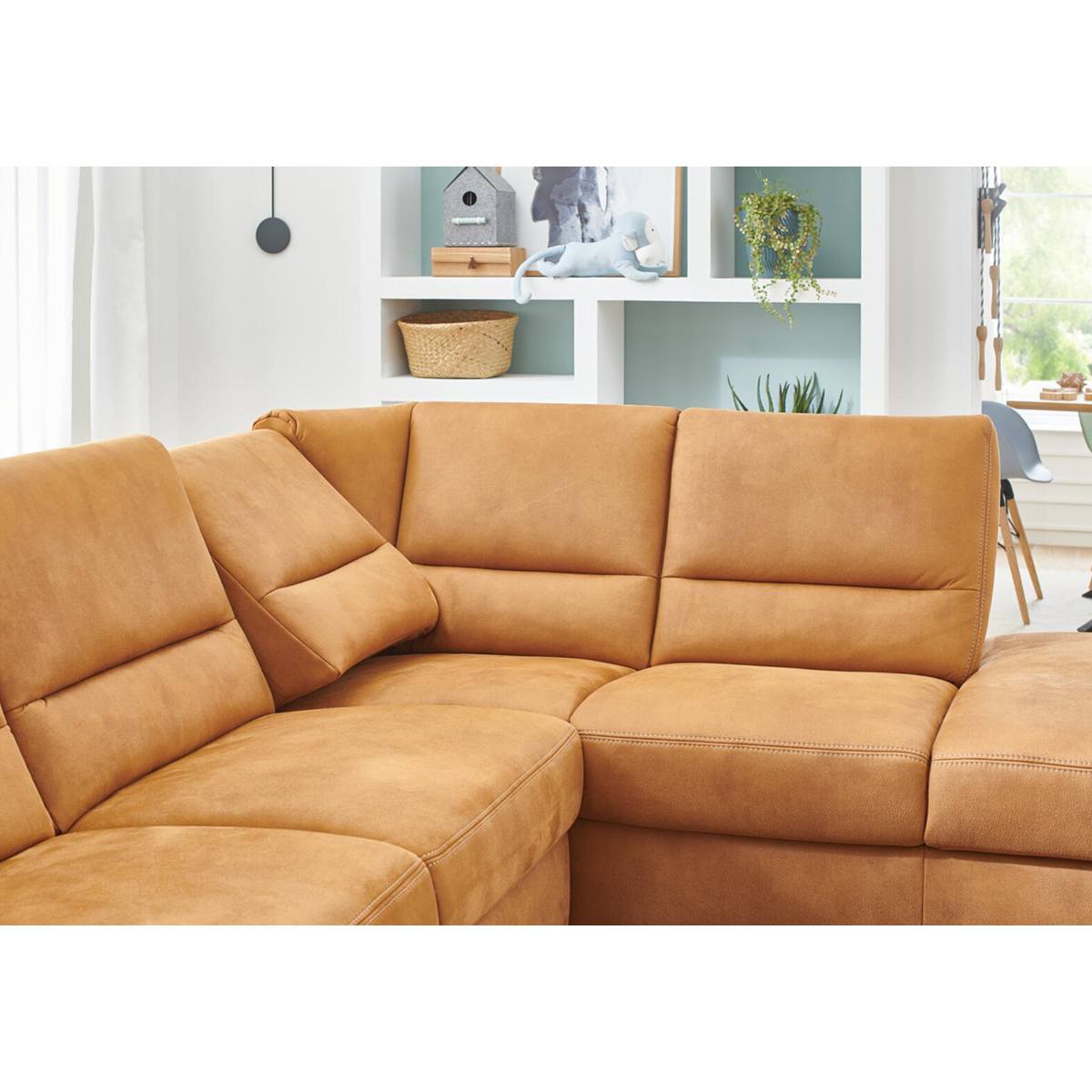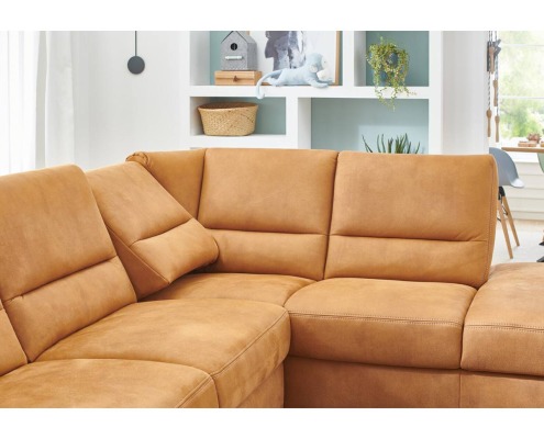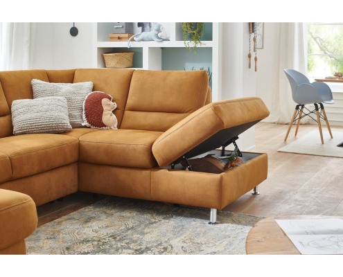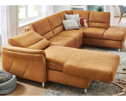 Wohnlandschaft Bezug Stoff Deluxe zimt mit beigefarbener Kontrastnaht, Metallfuß alufarbig, best. aus: Canapé mit Armteil links, 2-Sitzer ohne