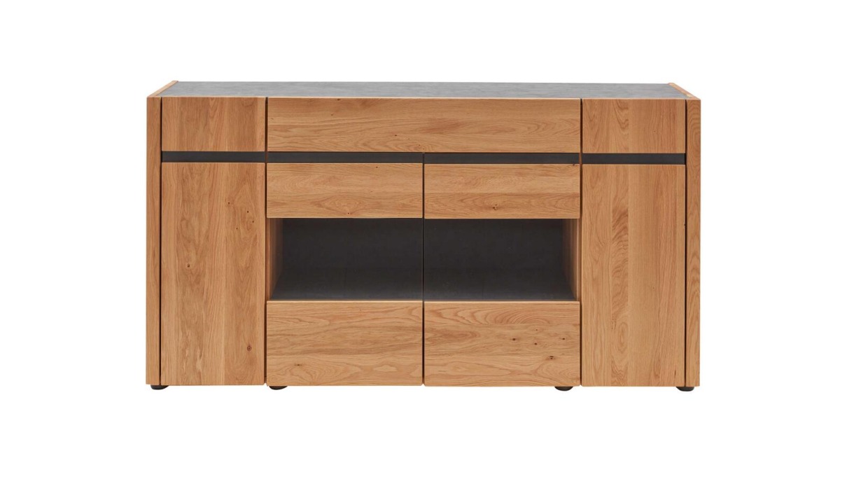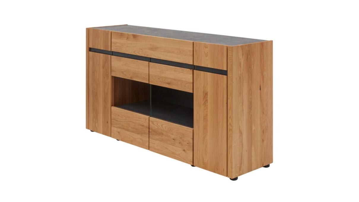 Anrichte Interliving 5603: 47-Wildeiche geölt, vollmassiv Oberboden in HPL Oxyde graphit, 2 Holztüren, 2 Glastüren, 1 SK,