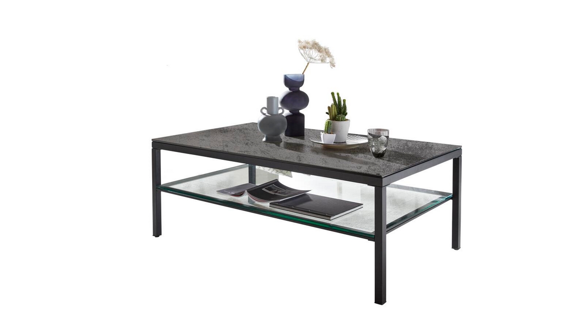Couchtisch (CT194SI) Interliving 6210: Stahl schwarz lackiert, Keramikplatte SI/silver, Ablage aus Klarglas, ca. 120 x 70 x H45 cm