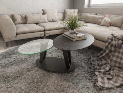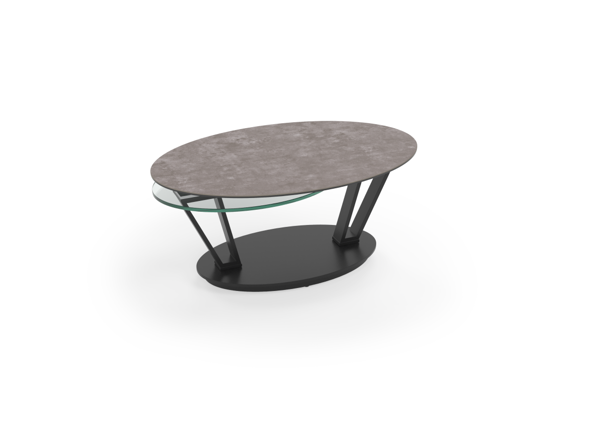 Couchtisch (CT638AR) Interliving 6207: Stahl schw. lackiert, Temper- glas, Keramikplatte AR/zement- grau, 2 drehbare Tischplatten