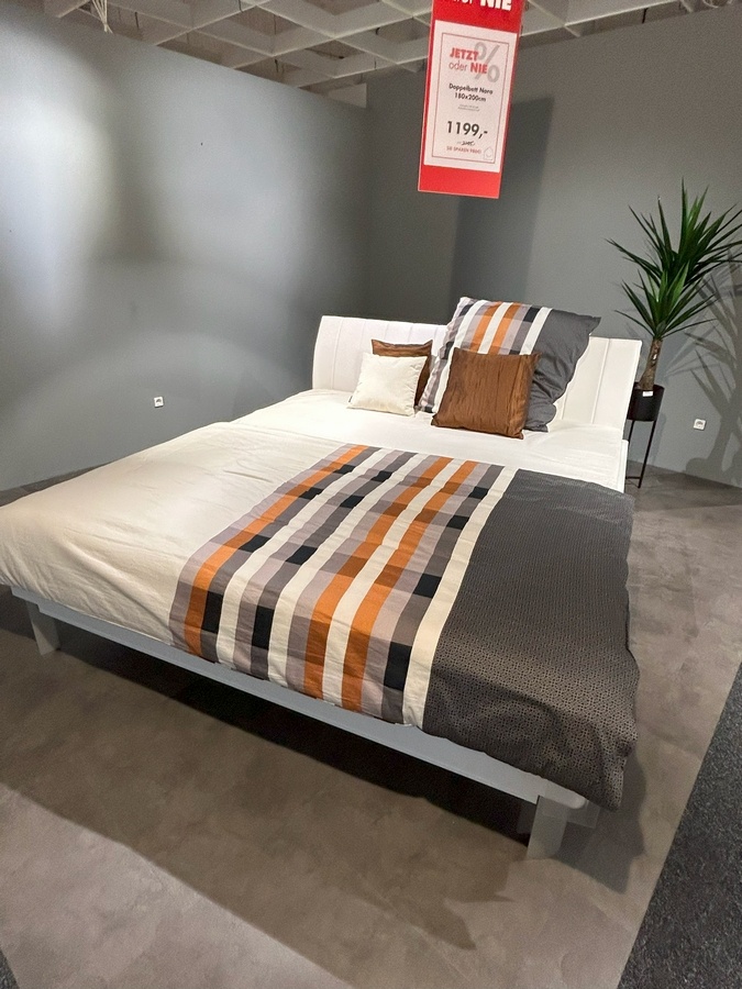 Doppelbett Nora: P9Polarweiss,180x200,Fuß221alu matt Version 2,Rückenl.:G51 Lederl.weiss