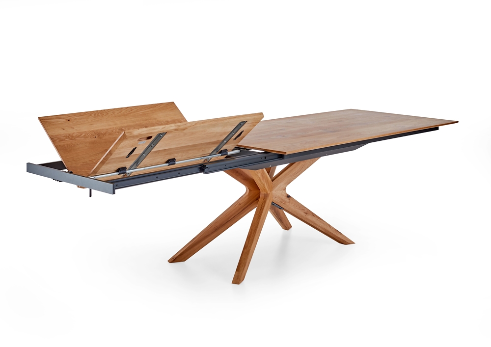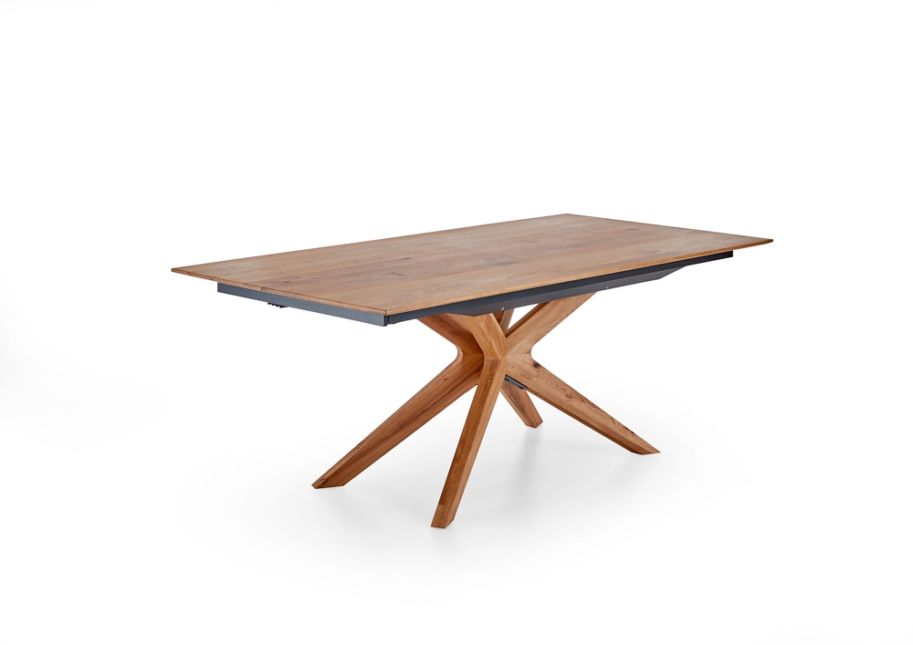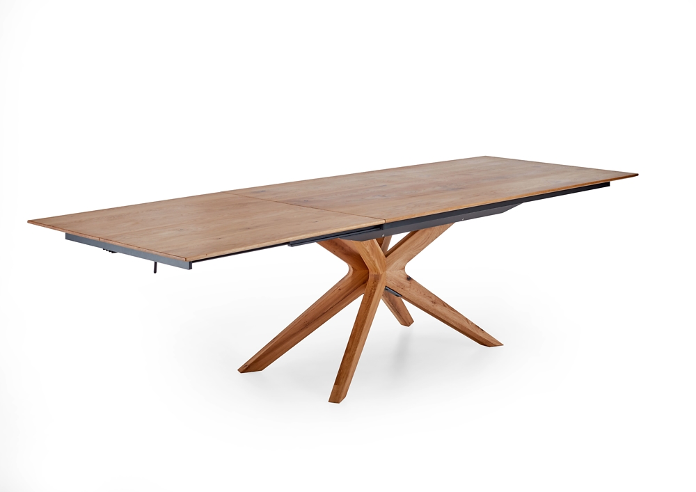 Esstisch (4923-79-078) 05310223: 79 Charakter-Eiche geölt, Platte massiv mit Facette, Sterngestell Eiche massiv, Falteinlage ca.90cm, Synchro-Schiebeplatten