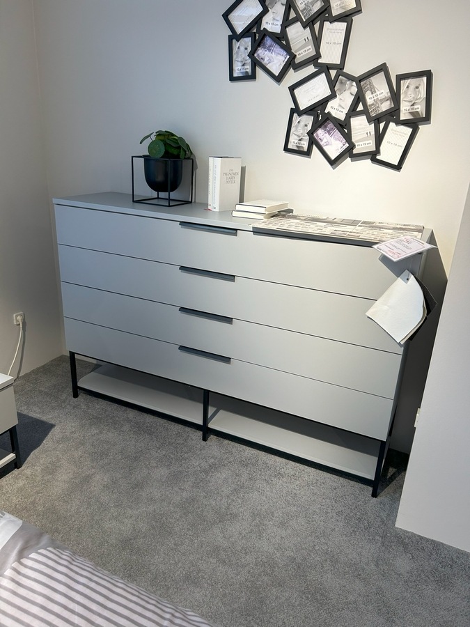 Großkommode Street: SI181899 / K+F Dekor Hellgrau, innen Texline, 4 SK, Griffe und Füße graphit, Vollauszug, B/H/T: ca.160x78x40cm
