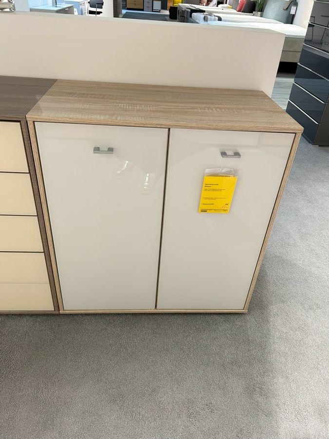 Herrenkommode Wilhelm: 599927 Eiche-Sägerau,NB,Glas weiß Griffe silber,2-türig,80x86x43cm