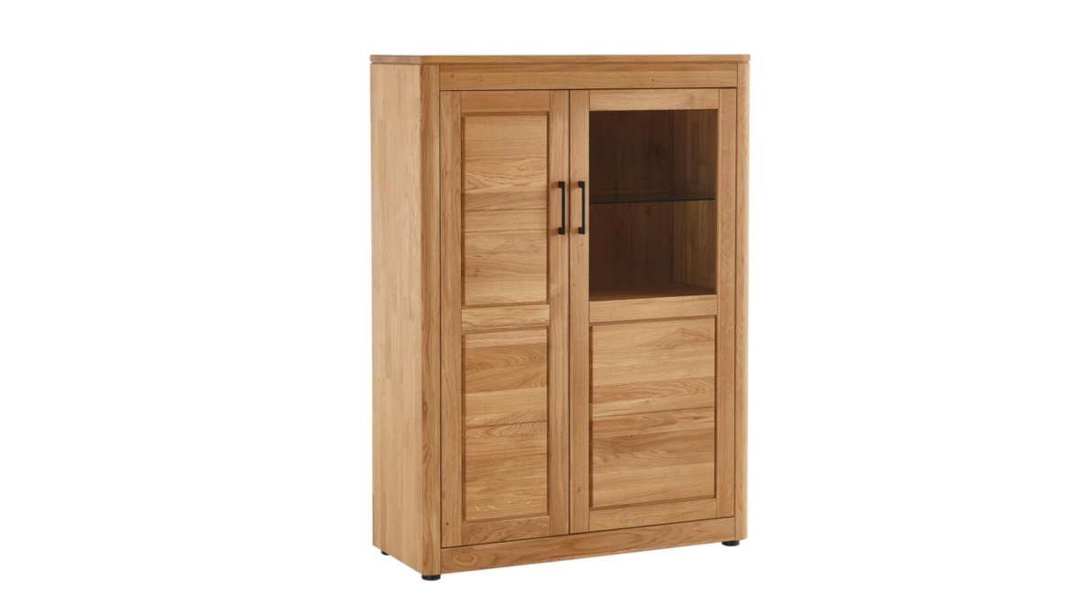 Highboard 12130001: Front Eiche vollmassiv durchgehende Lamellen, geölt, Korpus Eiche vollmasiv keilgezinkt, geölt, Griff schwarz matt