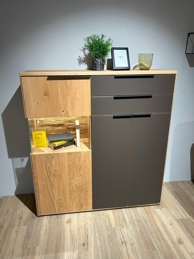 Highboard Interliving 2009: Wildeiche massiv soft gebürstet, Mattglas cubanit, 3-trg., 2 SK, B/H/T: ca.124x134x37cm