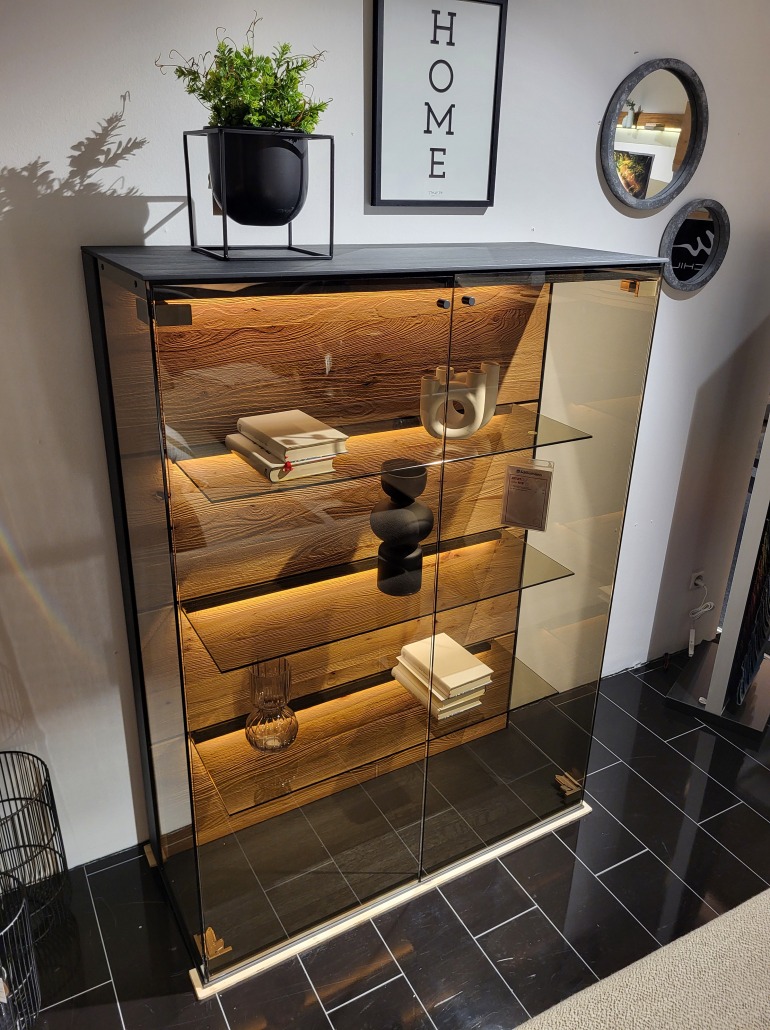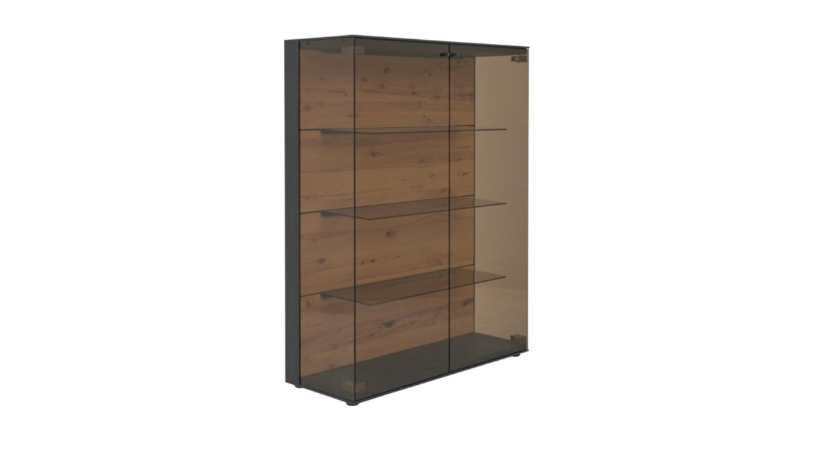 Highboard-Vitrine Interliving 2026: Riffbuche massiv, Kernesche gebürstet u. anthrazit gebeizt, B/H/T ca. 108x148x44 cm