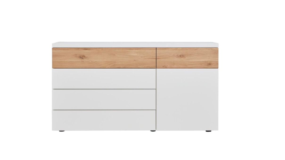 Kommode (523045) Interliving 1019: 3 SK Lack weiß, 1 SK und 1 Tür re. oben Wildeiche massiv,1 EB, B/H/T: ca.154x83x45cm
