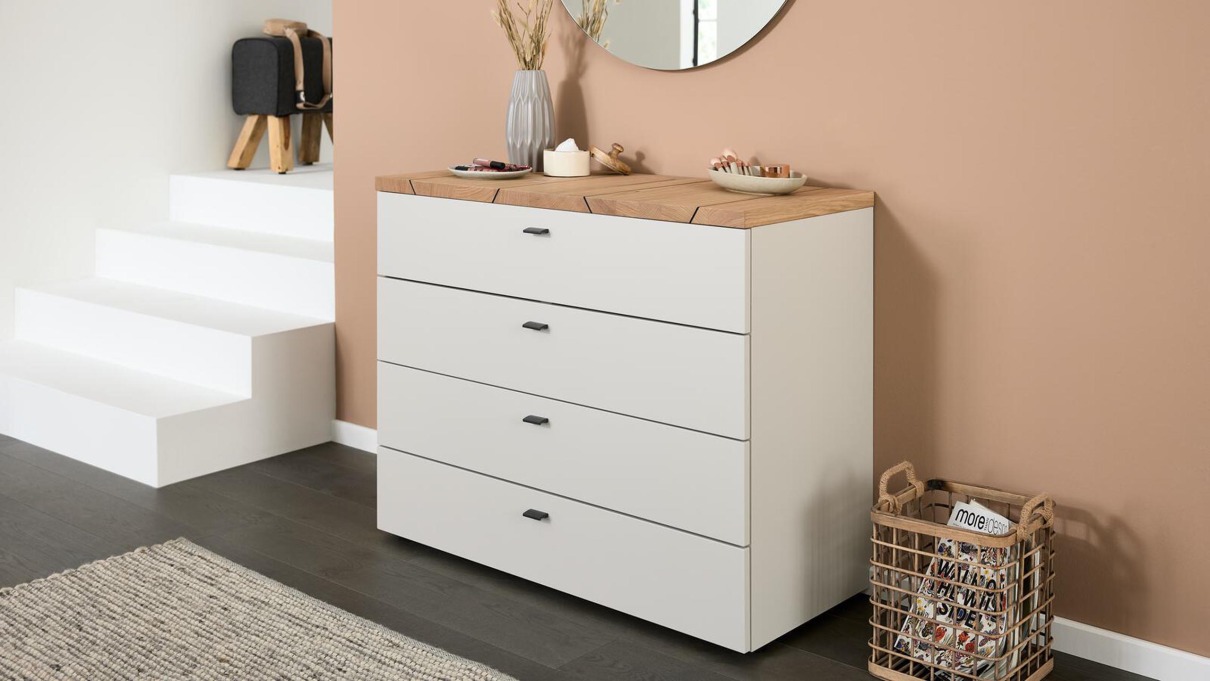 Kommode auf Fußgleiter Interliving 1030: K+F: 13 - Lichtgrau Mattlack, Abs.: Casa Wildeiche geölt (Furnier), 4 SK, B/H/T: ca.106x85x46cm