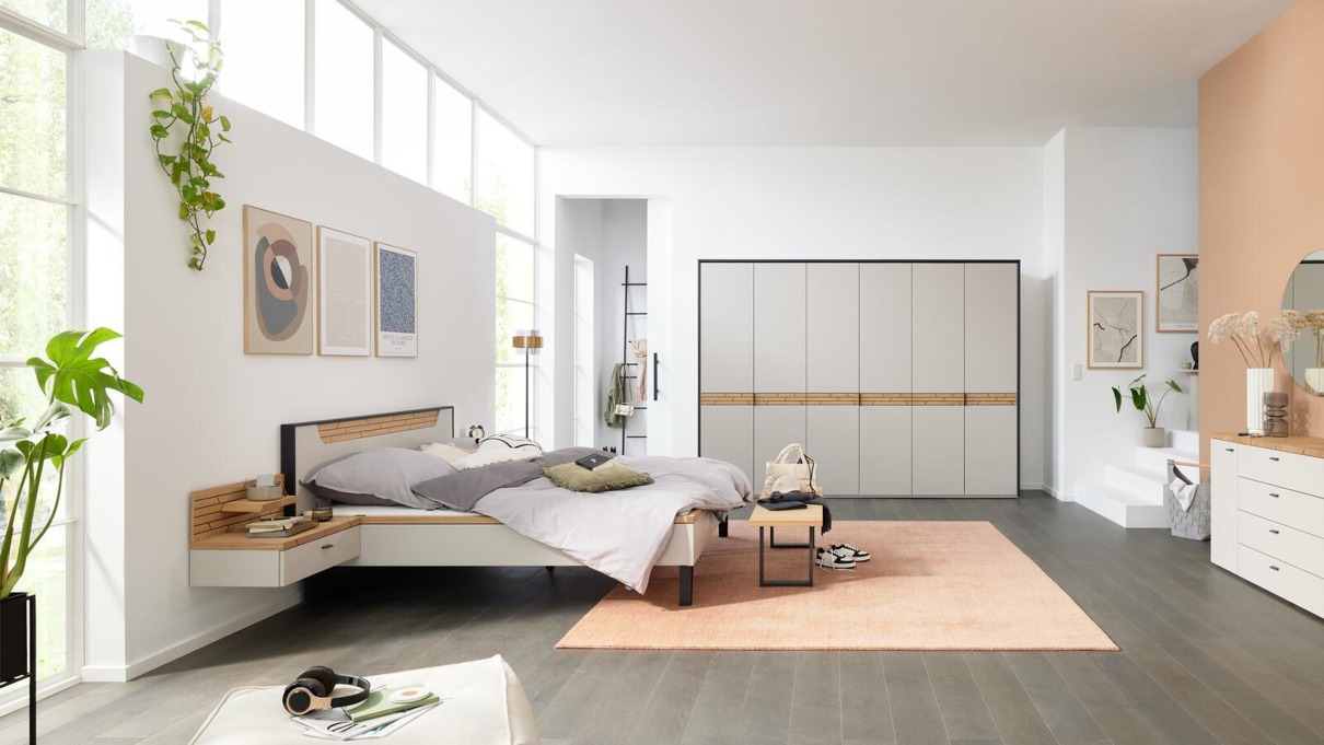 Schlafzimmer Interliving 1030: K+F: 13 – Lichtgrau Mattlack, Abs.: Casa Wildeiche geölt (Furnier), Griffe/Füße: Schiefer schwarz lackiert