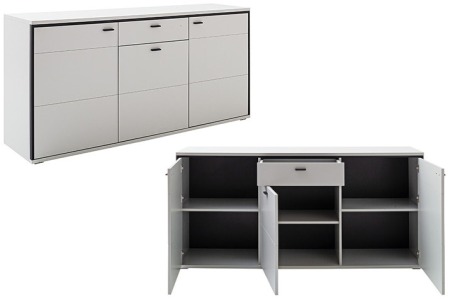 Sideboard 01362111: Modern White, Absetzung Schwarzgrau Griffe Metall schwarzgrau, 3 Türen, 1 SBK B/H/T ca. 183x89x44cm
