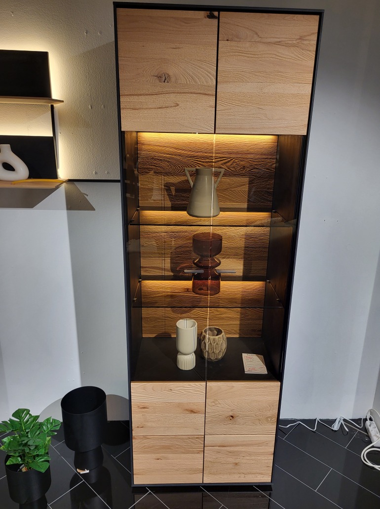 Vitrine Interliving 2026: Riffbuche massiv, Kernesche gebürstet u. anthrazit gebeizt, B/H/T ca. 69x205x44 cm