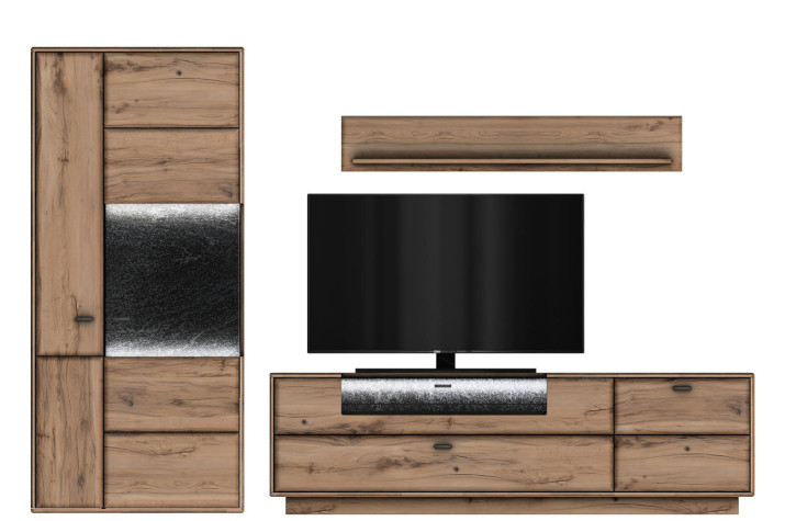 Wohnkombination 01362119: F/K: Ast/Balkeneiche massiv Kristalleiche geölt, Absetzung RW SteinVeneer Alpin, Griffe Metall anthrazit, B/H/Tca. 323/207/50 cm