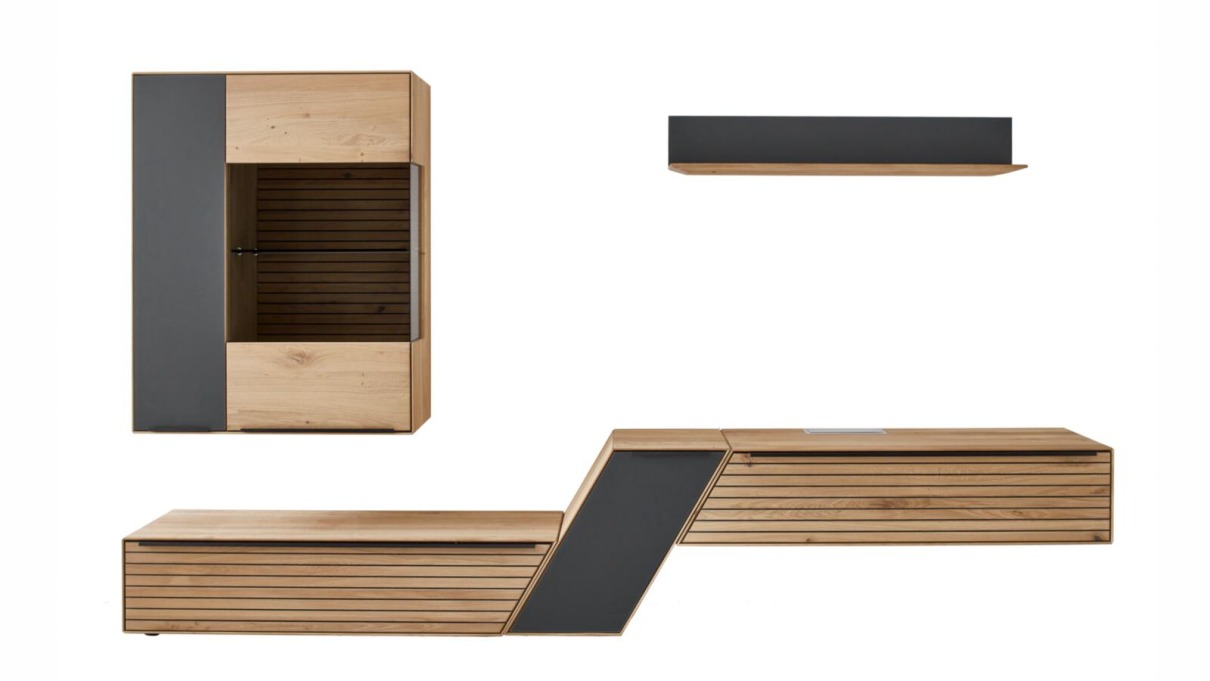 Wohnkombination 11210010: Asteiche bianco gebürstet, Glas Parsolglas grau RW Rillenoptik, Griff 53 anthrazit B/H/T ca. 314,9x195x47cm