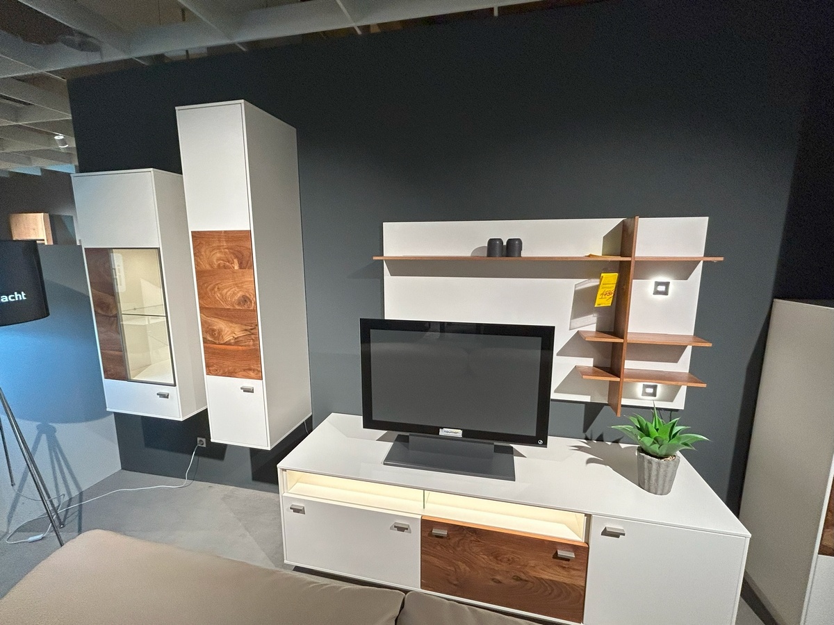 Wohnkombination Interliving-2101 : Lack Seidenmatt weiß / Astnussbaum natur furn., Griff edelstahlfarben