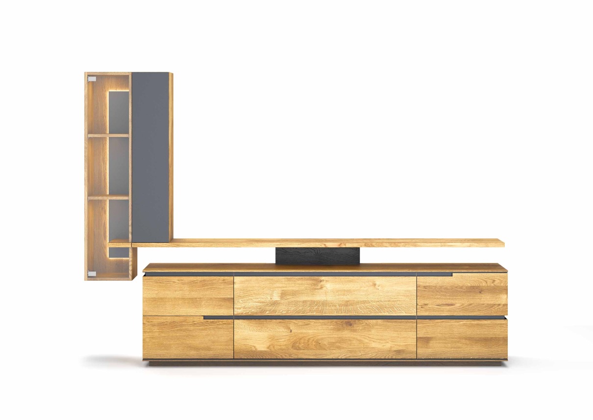 Wohnwand 20460006: 4/rustikale Asteiche Hartwachsöl natur gebürstet, Braunglas, RAL7021 schwarzgrau B/H/T ca. 285x194x56,1cm