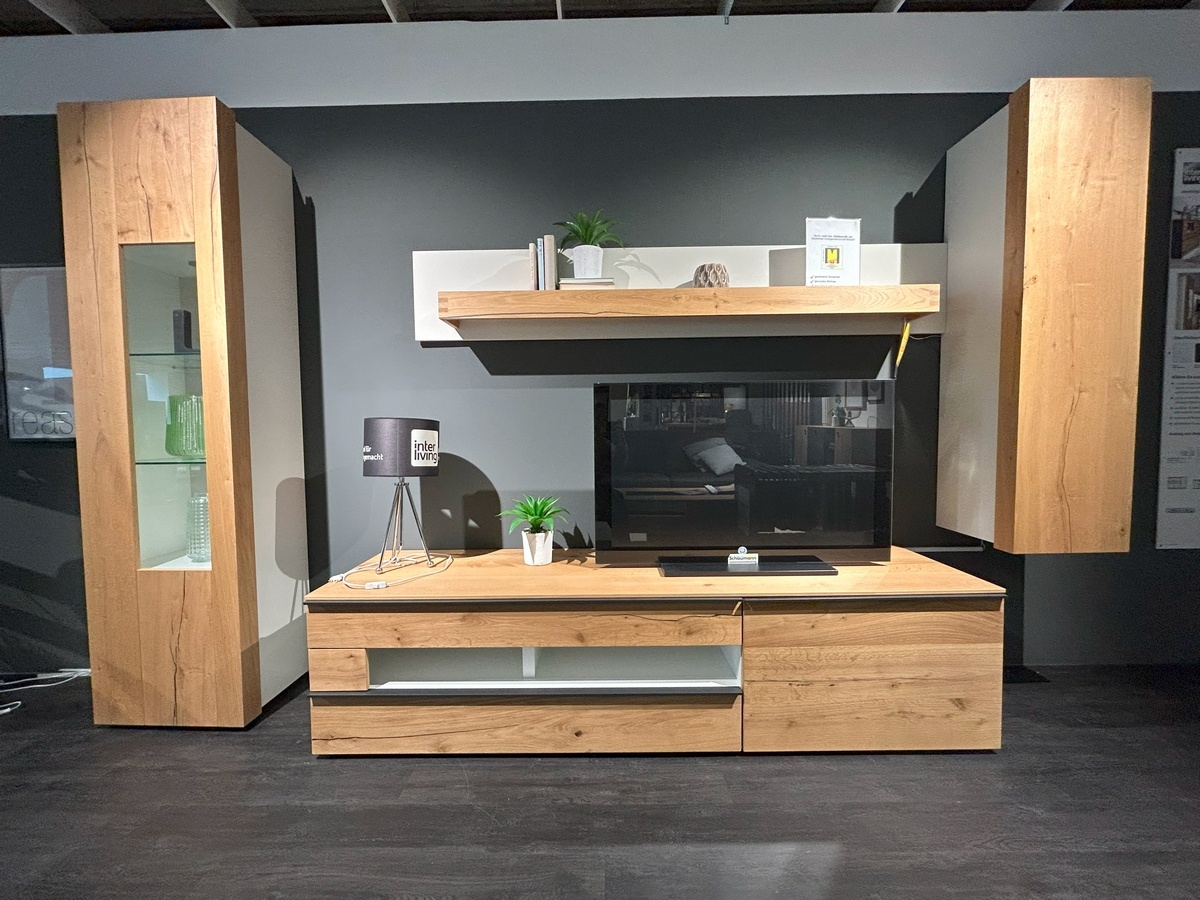 Wohnwand Interliving 2103: Asteiche hell furniert, Weiß matt- lack, Griffleisten Schiefer schwarz